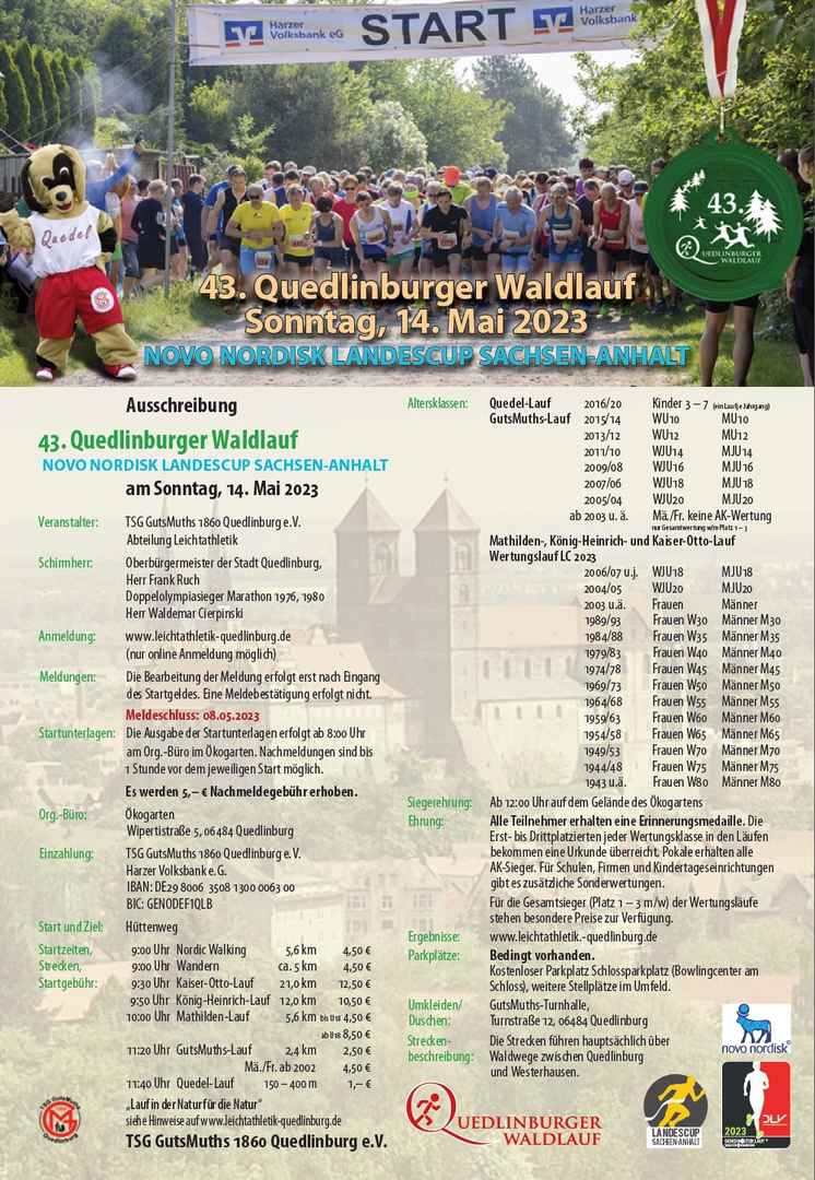 Am 2. Mai 2021 ist Meldeschluss beim 41. Quedlinburger Waldlauf. Die TSG GutsMuths lädt Sport- und Naturfreunde zum gemeinsamen Wandern (5 km), Nordic Walken (5,6 km), zum Laufen über 5,6 km, 12 km bzw. 21 km in den Hüttenweg und auf den Kamm der Altenburg zwischen Quedlinburg und Westerhausen.